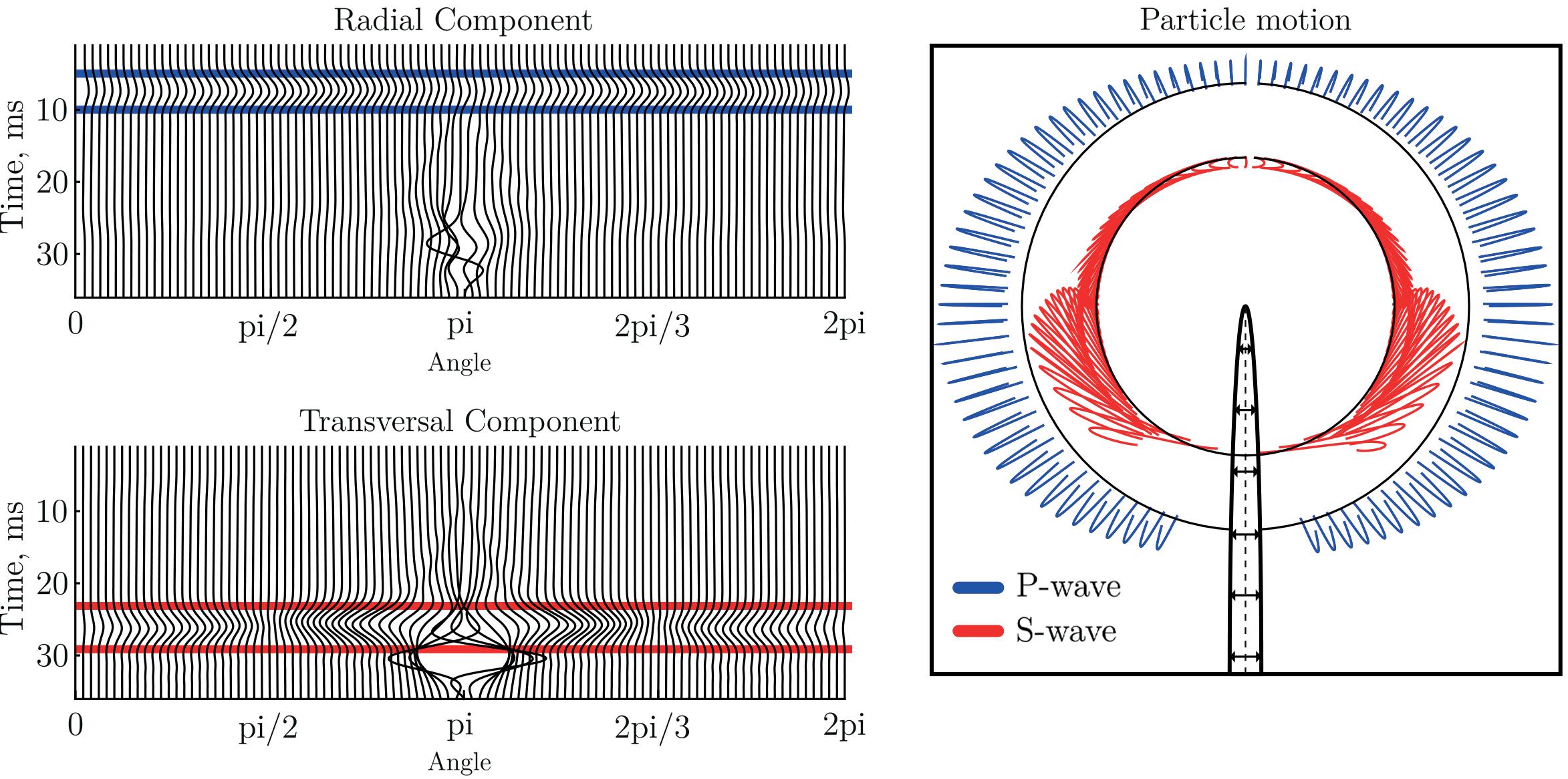 Figure 2. Elastic wavefield generated by the fracture tensile opening (no pre-existing crack, normal boundary stresses). Left: wavefield recorded on the circular line (cf. Fig. 1), radial component of particle velocity - top panel, transversal component bottom, windows of polarization analysis are shown for P-wave (blue lines) and S-waves (red lines). Right: particle motion trajectories for the time intervals of P-wave (blue) and S-wave (red).