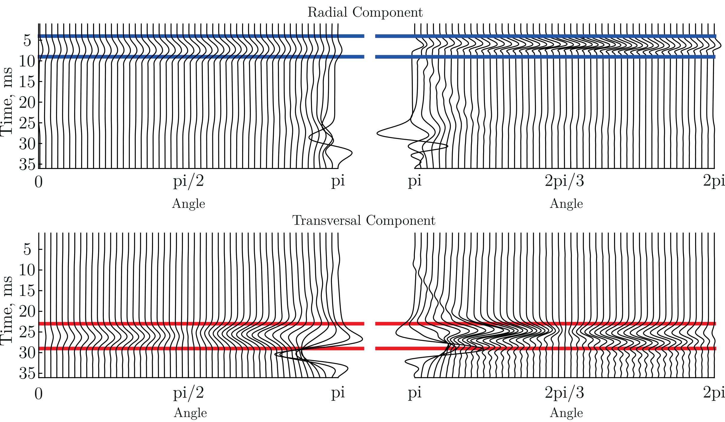 Figure 3. Elastic wavefield generated by the fracture tensile opening with a different speed (no pre-existing crack, normal boundary stresses) and recorded on the circle from Figure 1: top radial component; bottom - transversal component. Left: slow opening speed; right: fast opening speed.