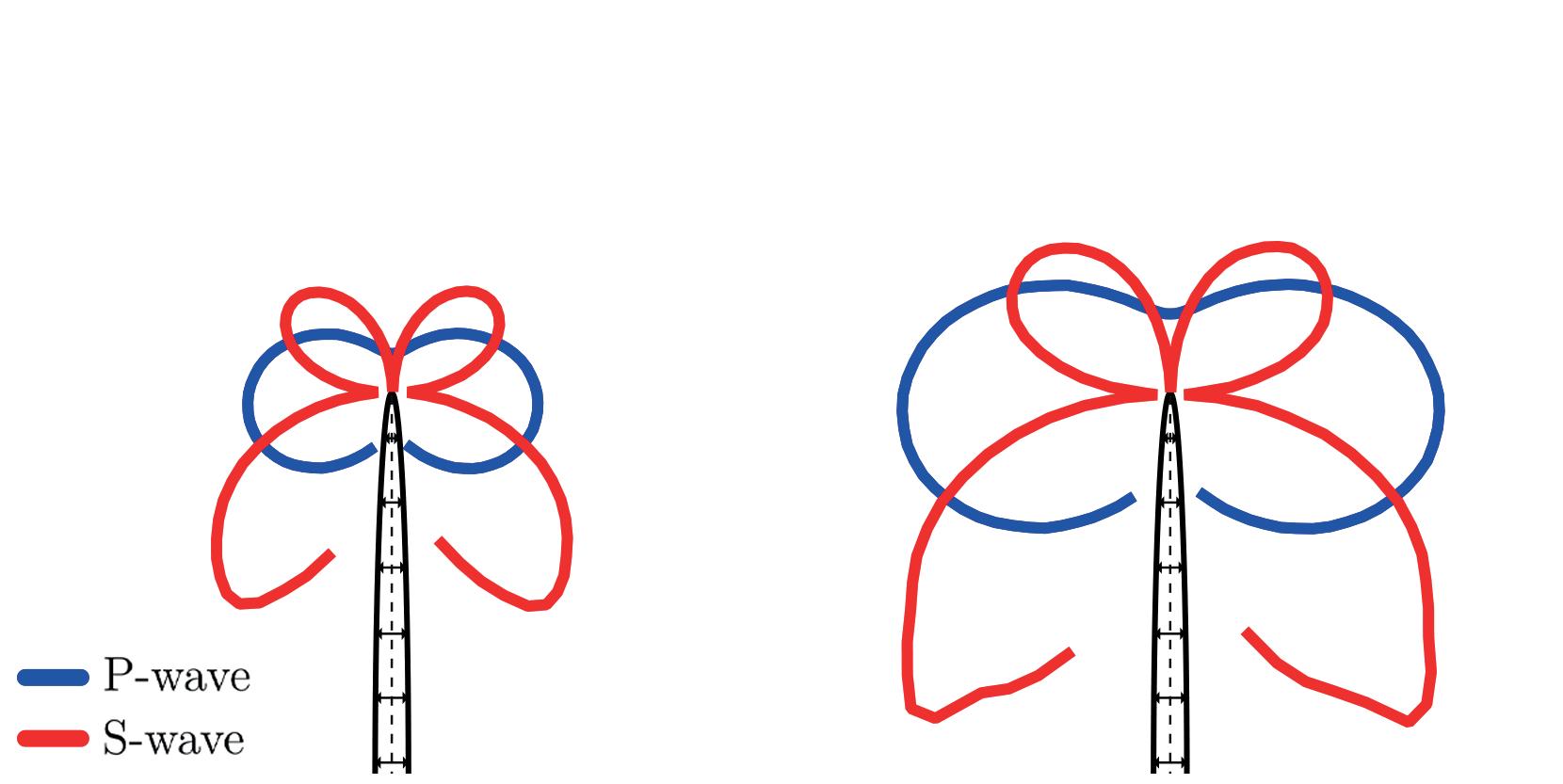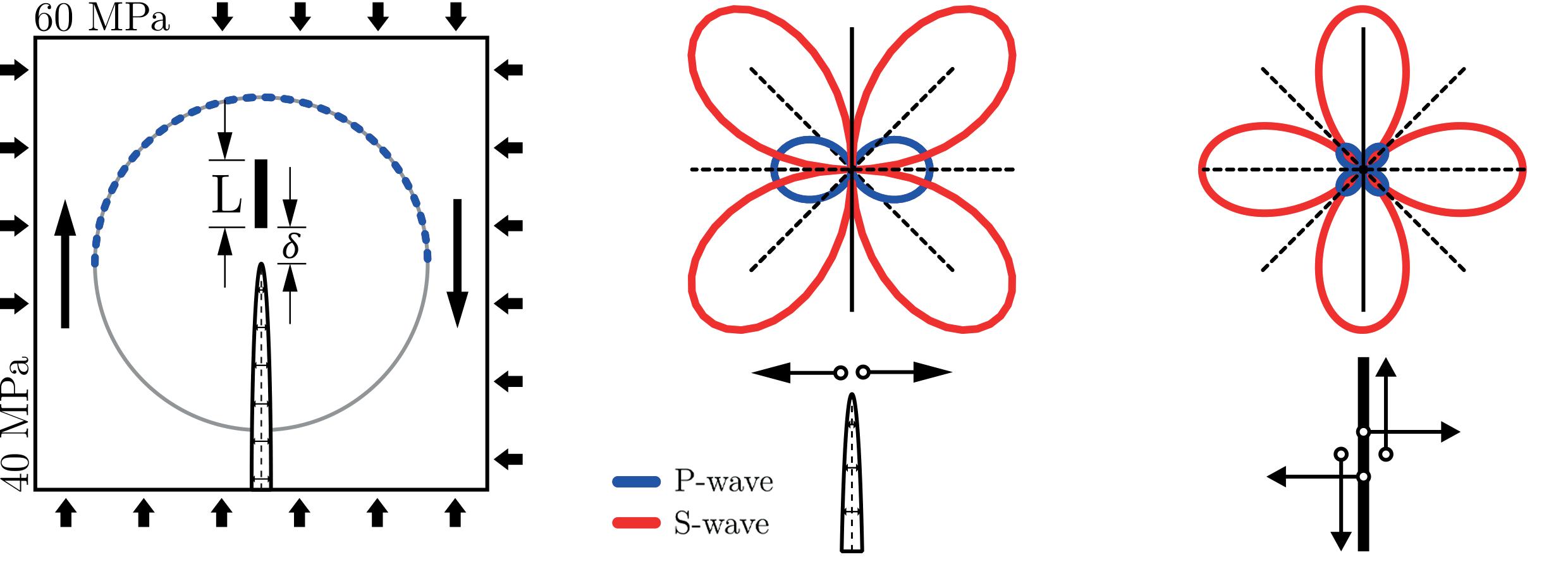 All scenarios of the main fracture advancement include its incremental growth to the length δ (see Figure 1,A). This growth may have a tensile-type mechanism caused by a pressure inside the main fracture (mimics hydro-fracturing). Corresponding radiation patterns of P- and S-waves are shown in Figure 1,B (dipole-type source). Alternative scenario of the fracture growth is a shear-type mechanism caused by the boundary shear stress (mimics fault activation). Corresponding radiation patterns of P- and S-waves are shown in Figure 1,C (double-couple source).