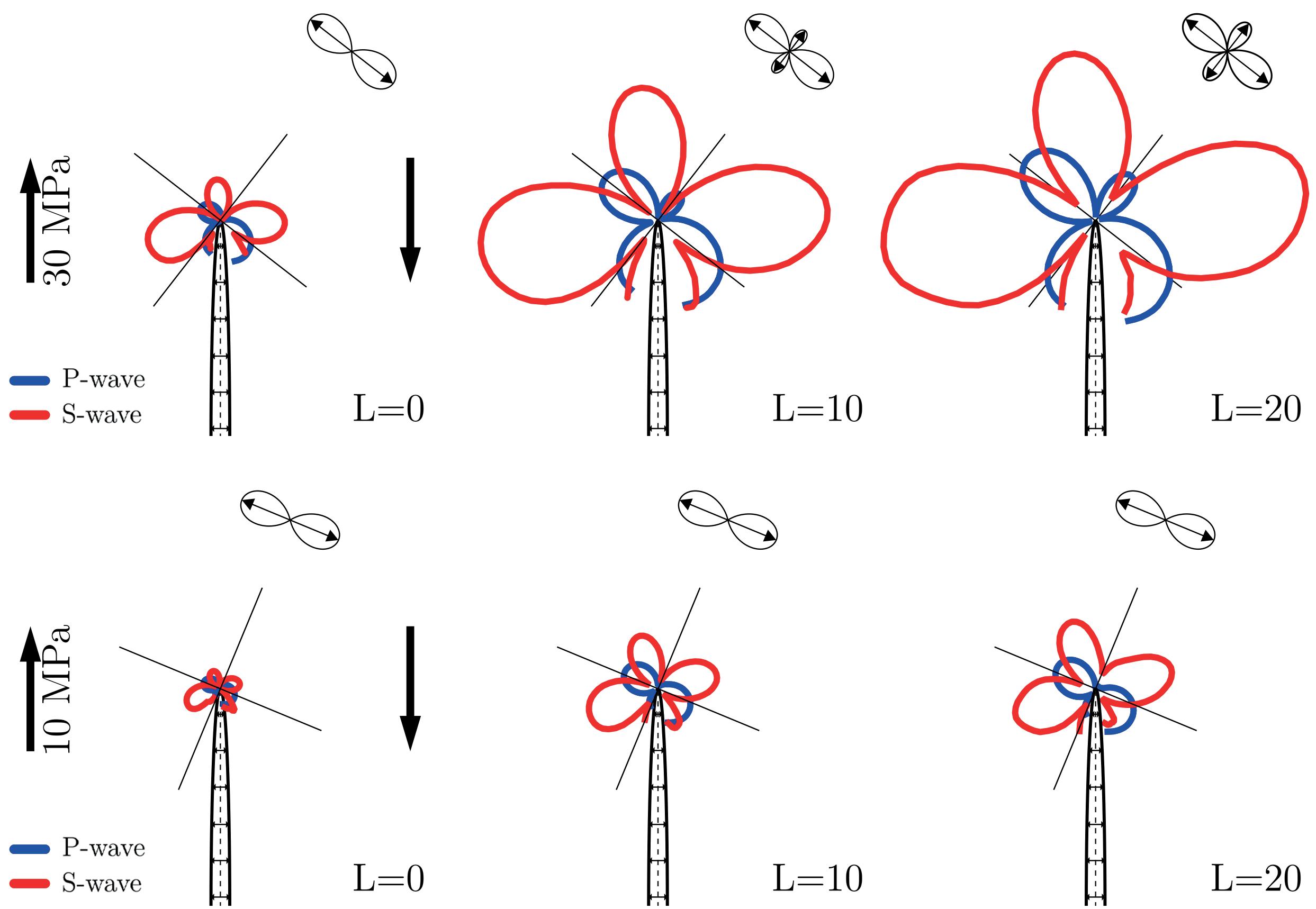 Now we consider the case the shear boundary stress added to the normal boundary stress and the tensile mechanism of the fracture growth. Corresponding radiation patterns are shown in Figure 6 for the shear boundary stresses of 10 MPa (bottom row) and 30 MPa (top row). As usual, blue lines correspond to P-waves, red lines – to S-waves. Note that at the boundaries we now add shear stresses (at the sides) to the normal stresses (cf. Figure 1). Thin lines show orientations of the principal stresses of the resultant stress field. Columns in Figure 6 correspond to different length of the pre-existing crack: no crack (A, D),