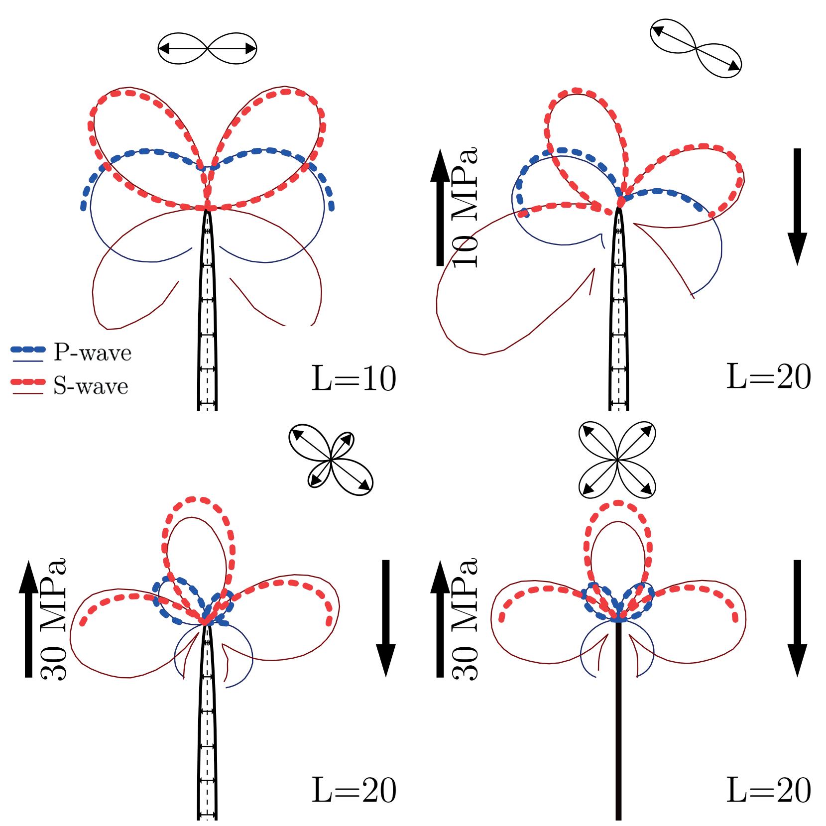In Figure 6 one can see that the intensity of generated waves increases when value of the shear stress increases (from the bottom up) or length of the pre-existing crack increases (from left to right). In the panels we also show how the P-wave radiation pattern can be interpreted in terms of the dipole sources (the S-wave radiation pattern is more complicated and deviates more from the ideal patterns). Note that small shear stress rotates the stress orientations. And the radiation patterns derived from seismic waves correspond to the rotated dipole aligned with these stresses instead of the fracture growth direction (Figure 6, bottom row). For larger boundary shear stress the stress orientations are rotated even more. The P-wave radiation patterns are still aligned with these directions but they are do not look like corresponding to a pure dipole type (Figure 6, top row). They start looking like a rotated double dipole source which will further transform into a double-couple source for even stronger boundary shear stresses.