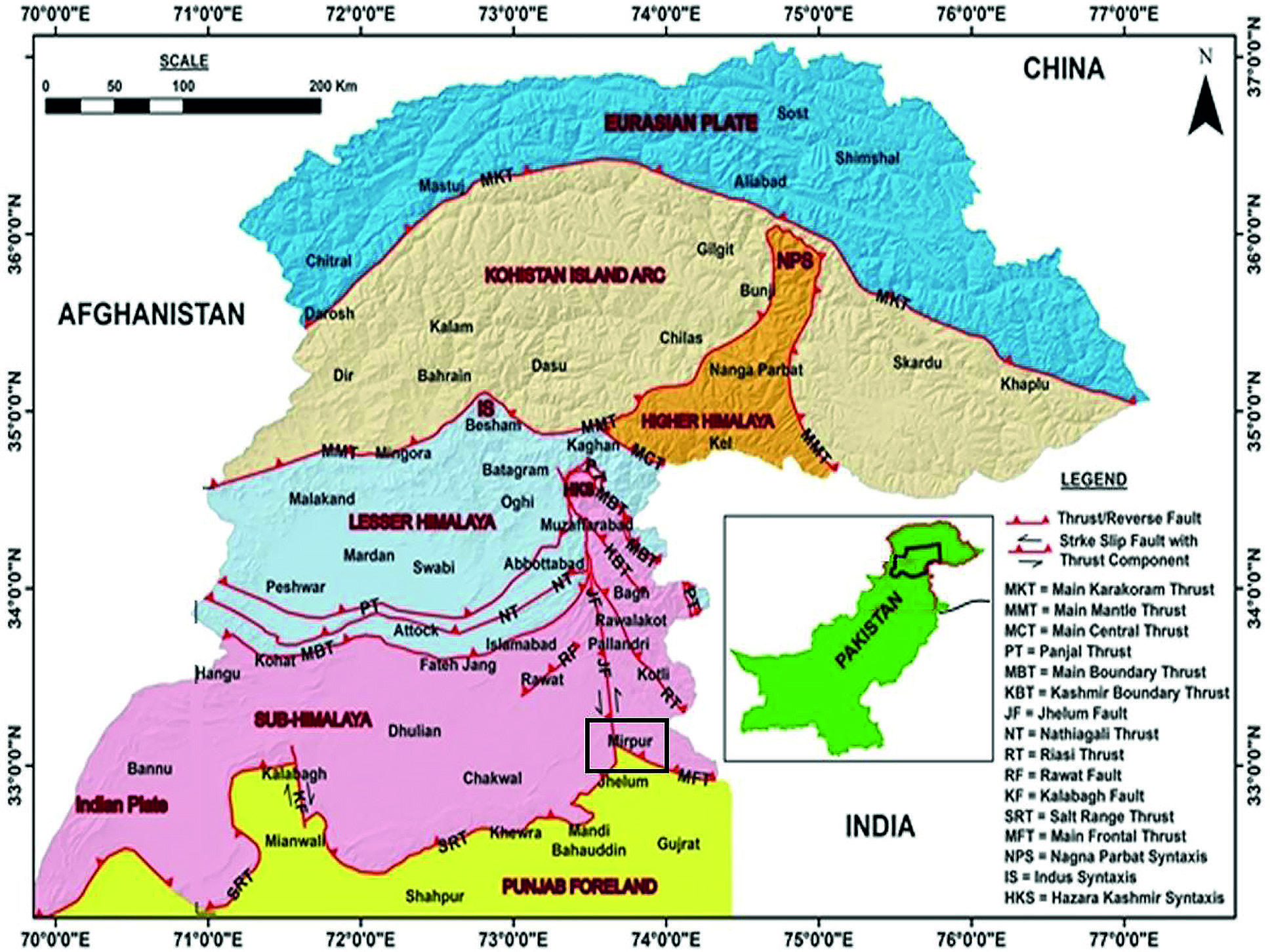 A comprehensive investigation of the aquifers is necessary to assess the impact of earthquakes on water quality in a given region. A series of earthquakes with varying magnitudes occurred along the thrust fault system in the Main Frontal Thrust (MFT) and Jhelum fault (Figure 1). The vicinity of Mirpur city and the surrounding areas experienced a significant earthquake in September 2019, measuring 5.9 on the Richter scale. The aftermath of the Mirpur earthquakes significantly deteriorated groundwater quality in the region resulting in a severe scarcity of potable water for the local population. Residents reported a noticeable decline in water quality, prompting a comprehensive survey to assess the extent of the issue. The ERT has proven to be a valuable tool for assessing subsurface conditions associated with such events (Khan et al., 2022; Park et al., 2022; Nisar et al., 2024b). A study conducted in the epicentral region of the Mw 5.8 Mirpur