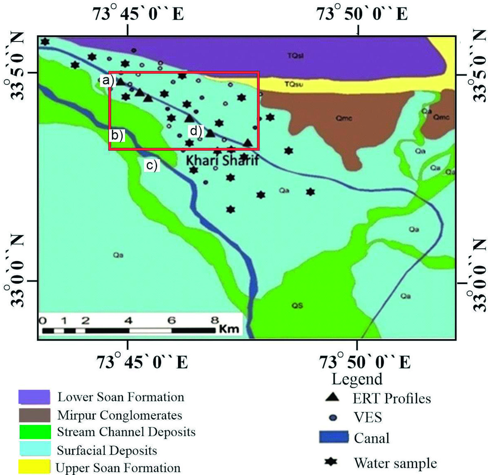 Figure 2 Surface geological map of the study area showing surface observation sites (a-d), VES, ERT and water samples locations.
