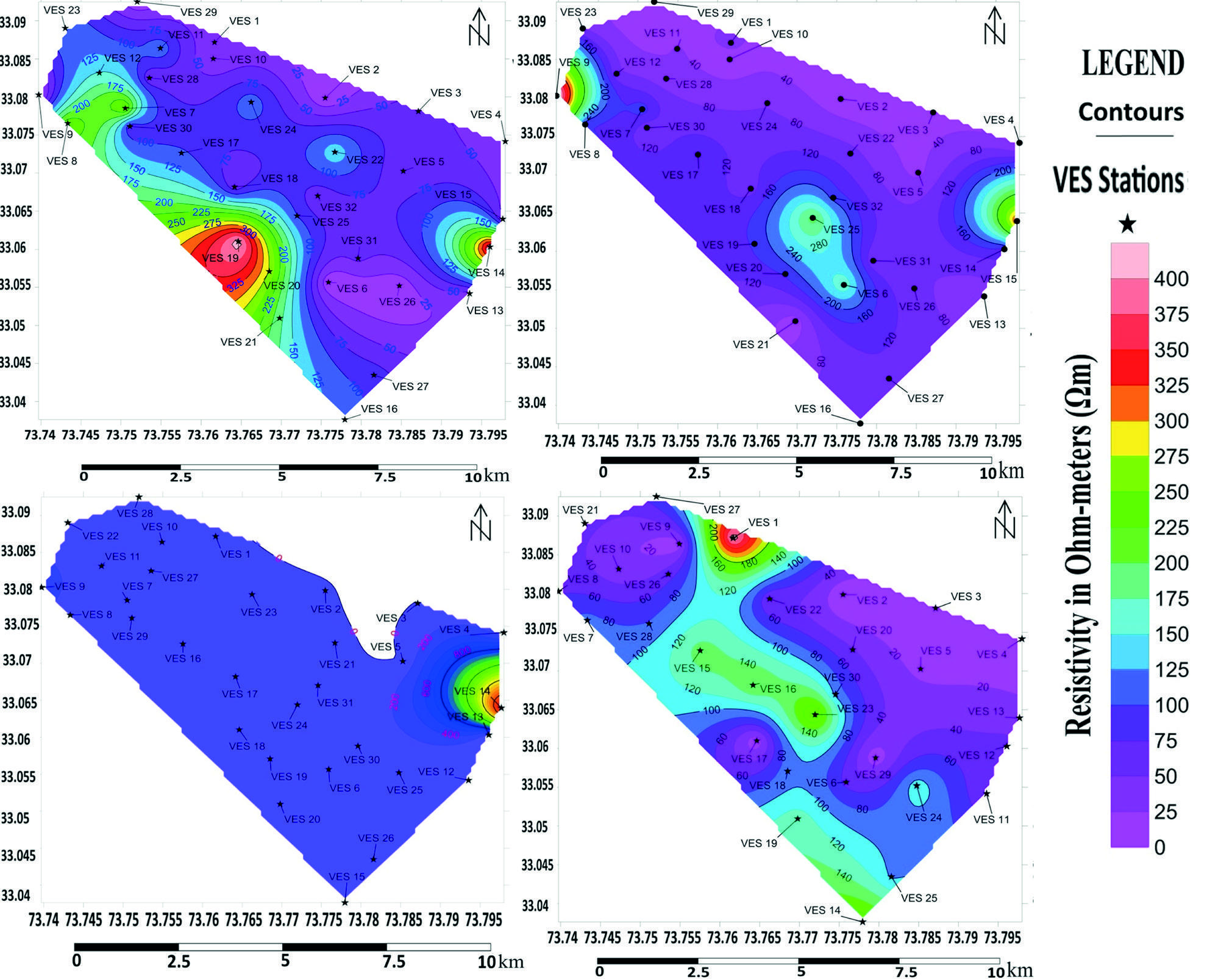 The water-bearing subsurface strata consist of sandy clay, sand, gravel, and boulders, characterized by high porosity and permeability (Lenkey et al., 2005; Oseji et al., 2005). However, clay is highly saturated in the close vicinity of the Jhelum Canal suggesting a local unconfined aquifer unit. VES were also utilized to generate iso-resistivity maps at 50m, 100m, 150m, and 200m depths (Figure 3a-3d). This horizontal slice of iso-resistivity suggested the distribution of subsurface lithology at a specific depth and water saturation level. A subsurface layer inferred from the resistivity values at this depth is an aquifer unit. An aquifer thickness map is generated for the sand with boulder layer present at about 100m depth based on the VES dataset (Figure 3b). Based on this iso-resistivity map the low resistivity values show the higher groundwater potential at a depth of 100m (Figure 3b). The resistivity values increase at a depth of 150m (Figure 3c) compared to Figure 3b, suggesting less potential for groundwater. In the map of 200 m the good potential of groundwater is also observed in north-east and north-west direction (Figure 3d). The iso-resistivity maps have indicated good potential for groundwater in the region.