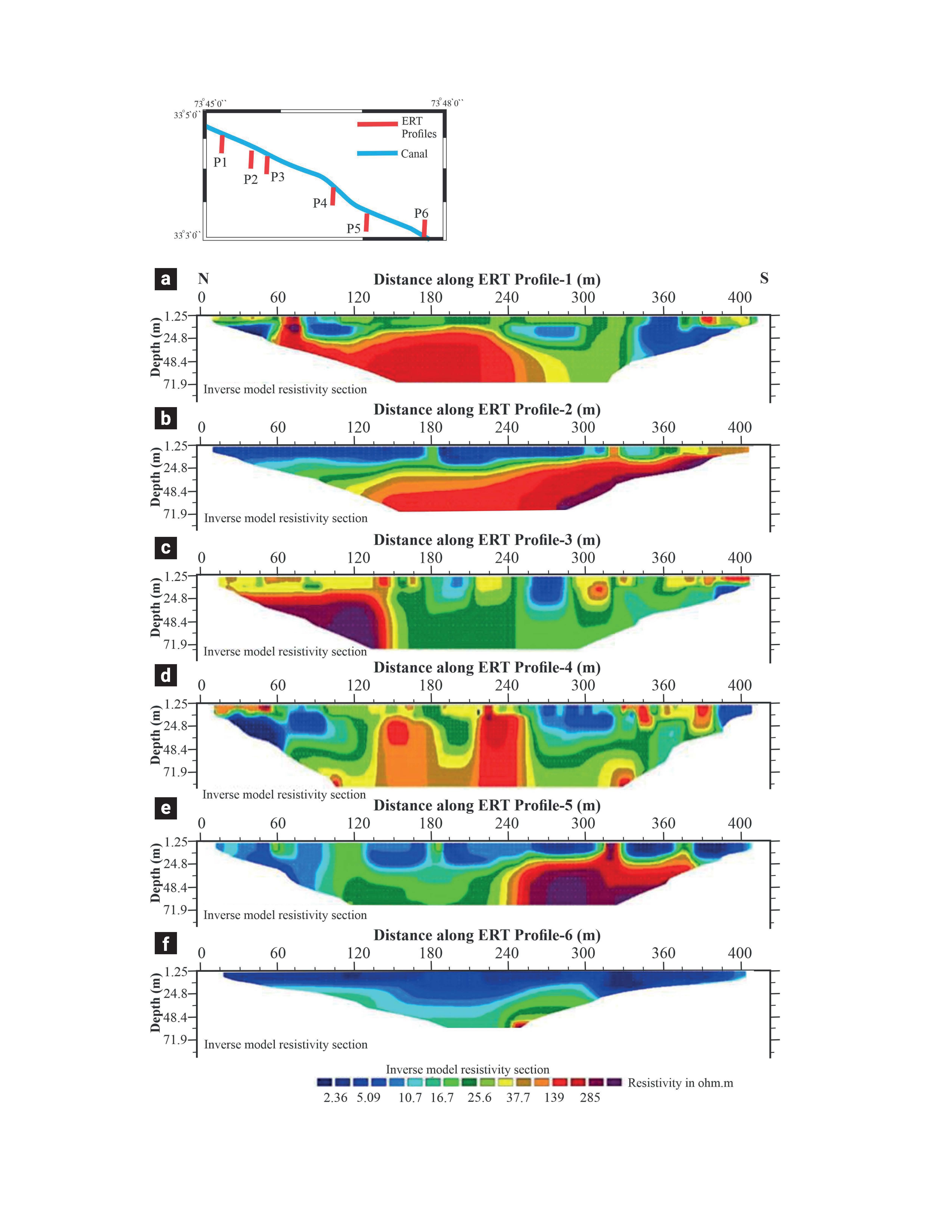 provide imaging to a depth of about 70 m. The ERT profiles were acquired at different distances from the canal to observe the liquefaction-induced subsurface disturbances, such as intrusions, sand blows, and fractures, and to delineate the liquefaction zone. We inferred the lithologies from resistivity of subsurface based on the work of previous studies (Khan et al., 2021a). Based on the resistivity values, three subsurface layers have been identified across the upper Jhelum Canal: (i) resistivity values below 10 Ωm is inferred as saturated clay; (ii) resistivity values ranging from 10 to 40 Ωm are interpreted as saturated sand with gravel and clay; and (iii) resistivity values above 50 Ωm are attributed as gravel with sand.