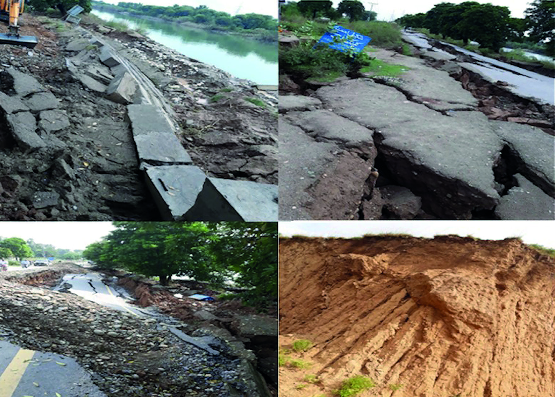 Figure 5 a, b, c showing liquefaction effect and subsidence in saturated clay along the UJC due to earthquake shaking at different locations, and d) an exposed clay deposit in the area.