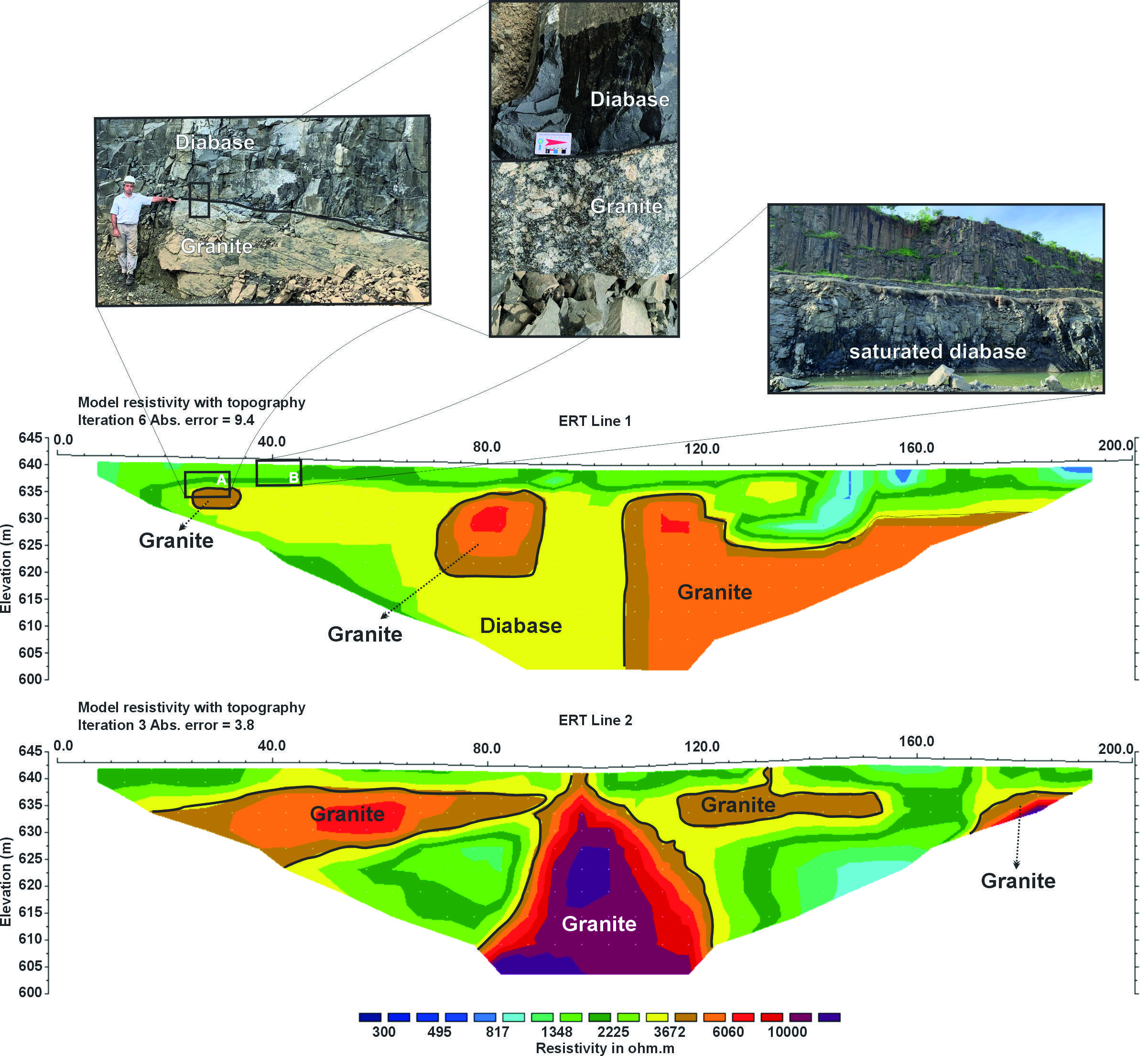 The geophysical acquisition was preceded by a local geological survey to identify the main geological elements and their influence on physical properties that can be measured using the ERT technique. The structural context and water percolation are fundamental factors for this type of geophysical technique, which is based on contrasting the electrical properties of the physical environment. Columnar diabase presents highly permeable conditions in terms of groundwater flow, the presence of which in this type of rock drastically reduces its resistance to the transit of electric current, i.e. an electrically conductive rock (low electrical resistivity). The low degree of fracturing in granite makes it relatively impermeable, which contributes to its classification as an electrically insulating rock, characterized by high electrical resistivity. Granite's mineralogical composition, primarily feldspar and quartz, is inherently resistant to electrical conductivity. However, the impermeability is predominantly due to its low fracture density, as fractures are the primary pathways for fluid movement and storage in crystalline rocks. The absence of interconnected fractures significantly limits the presence of water, which is a key factor in reducing resistivity in geological materials. The contact between the diabase and granite is abrupt, as evidenced by the contrasting resistivity values observed in the data. The granite's horizontal fractures are sparse and isolated, further limiting fluid percolation. This abrupt contact can be attributed to differences in lithological properties and the intrusive nature of the diabase, which cooled rapidly, preserving the distinct boundaries with the pre-existing granite. These characteristics highlight the granite's electrical behavior as being dominated by its structural and mineralogical properties, rather than external influences such as fluid saturation or weathering. This context implies an interface of low permeability for the water infiltrating the diabase, something that configures an aquifer level over this interface, the base of which lies precisely at the diabase/granite contact. This fundamental hydrogeological/structural context was adopted as a criterion for acquiring, processing and discussing the results. The results are presented and analyzed in a direct manner, i.e. 2D inversion model in terms of electrical resistivity. The local geological context made it possible to condition the analysis and interpretation of the data into 2 distinct groups: saturated diabase (between 300 Ω.m and 3600 Ω.m) and dry granite (between 3600 Ω.m and 10,000 Ω.m).