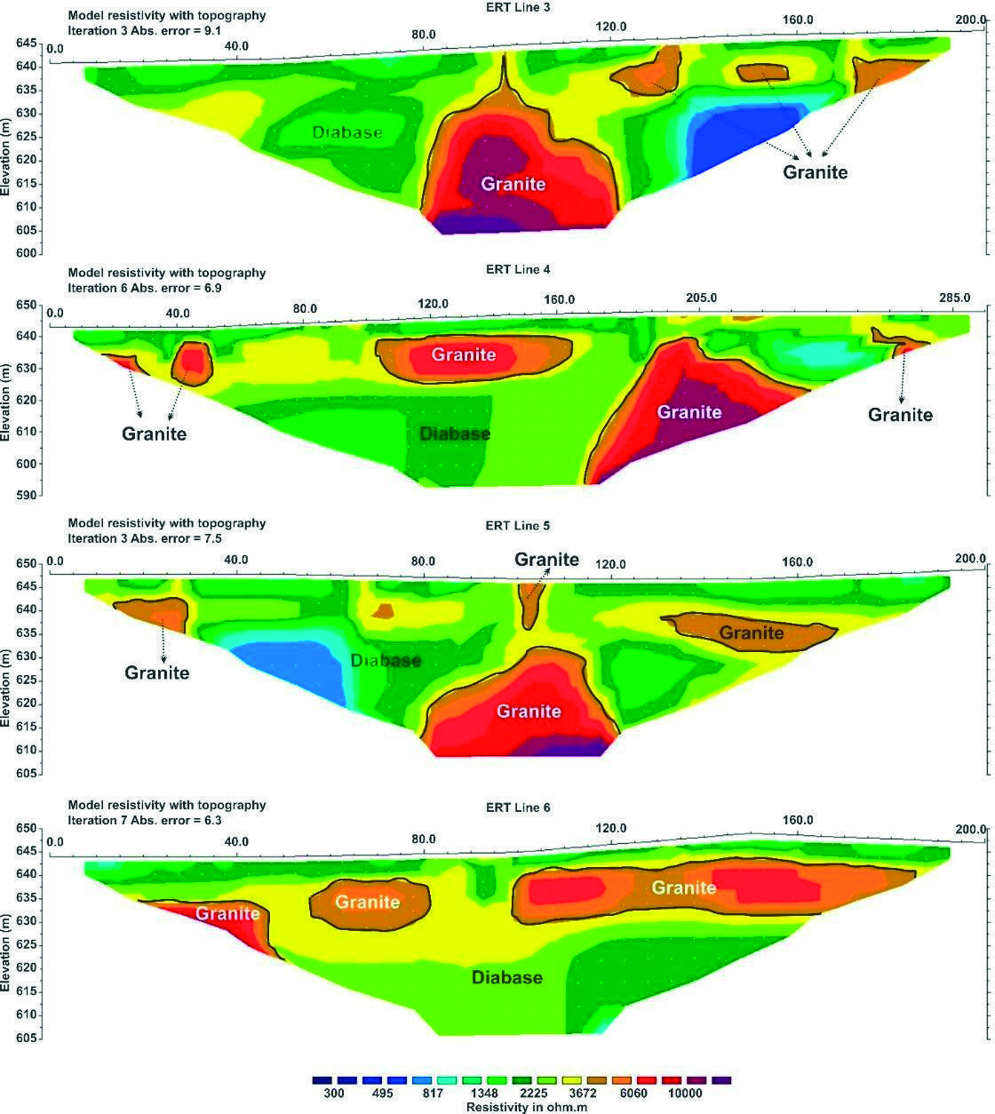 Figure 6. Inversion model for ERT lines 3, 4, 5 and 6, highlighting the interpretations of the electrical anomalies consistent with the ranges of values associated with the presence of diabase and granite in the mine area.