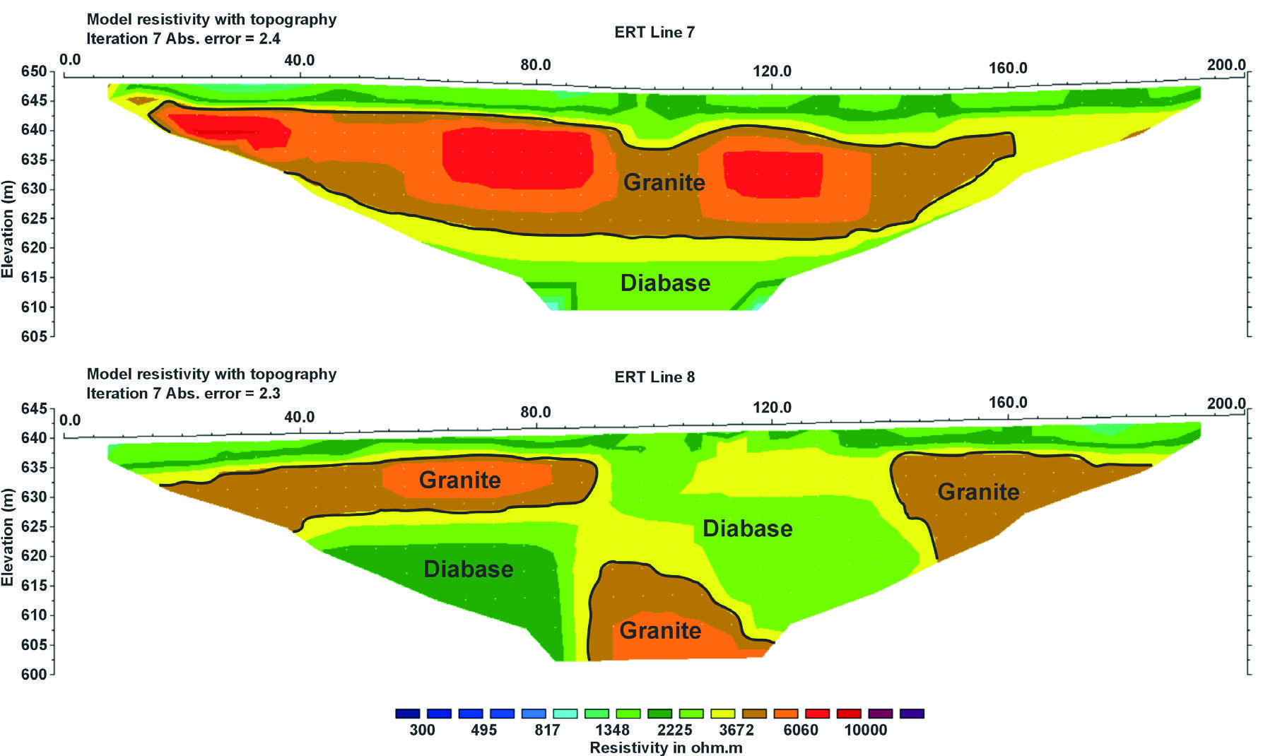 ERT lines 7 and 8 were oriented in a NW-SE direction and were positioned at the western and eastern ends of the pit, respectively. Line 7 was positioned on the southwestern edge of the pit bottom, at an elevation of between 648 m and 649 m. In this section, saturated diabase occurs as a horizontal outcropping layer up to a depth of 8 m. The lower resistivity values observed in this layer are consistent with the presence of water saturation within the diabase, as water increases the ionic conductivity of the material. Below this, the dry granite occurs in a wide horizon band between 8 m and 25 m deep. The granite exhibits significantly higher resistivity values due to its low porosity and the absence of interconnected water-filled fractures. Below this layer, the resistivity values decrease again, indicating the return of saturated diabase, suggesting the presence of deeper fracture zones filled with water (Figure 7). Line 8 was acquired parallel to line 7, positioned in the central part of the pit bottom, at elevations between 641 m and 643 m. This section is relatively similar to line 2, with an outcropping horizon of saturated diabase from the surface to a depth of 8 m. The resistivity values here again reflect the influence of water-filled fractures in the diabase. This horizon is underlain by dry granite with horizontal and central vertical cores, extending from 8 m to 45 m deep. The central granite core is characterized by higher resistivity values, indicating minimal water content and greater structural integrity, while the diabase layers adjacent to this core, with thicknesses up to 20 m, show lower resistivity, reflecting water saturation. These variations in electrical resistivity along the sections are mainly controlled by the distribution of water in the subsurface, which depends on the lithological and structural characteristics of the diabase and granite. The electrical resistivity contrasts provide a clear delineation of the water-bearing zones and emphasize the influence of fractures and lithology on geophysical responses.