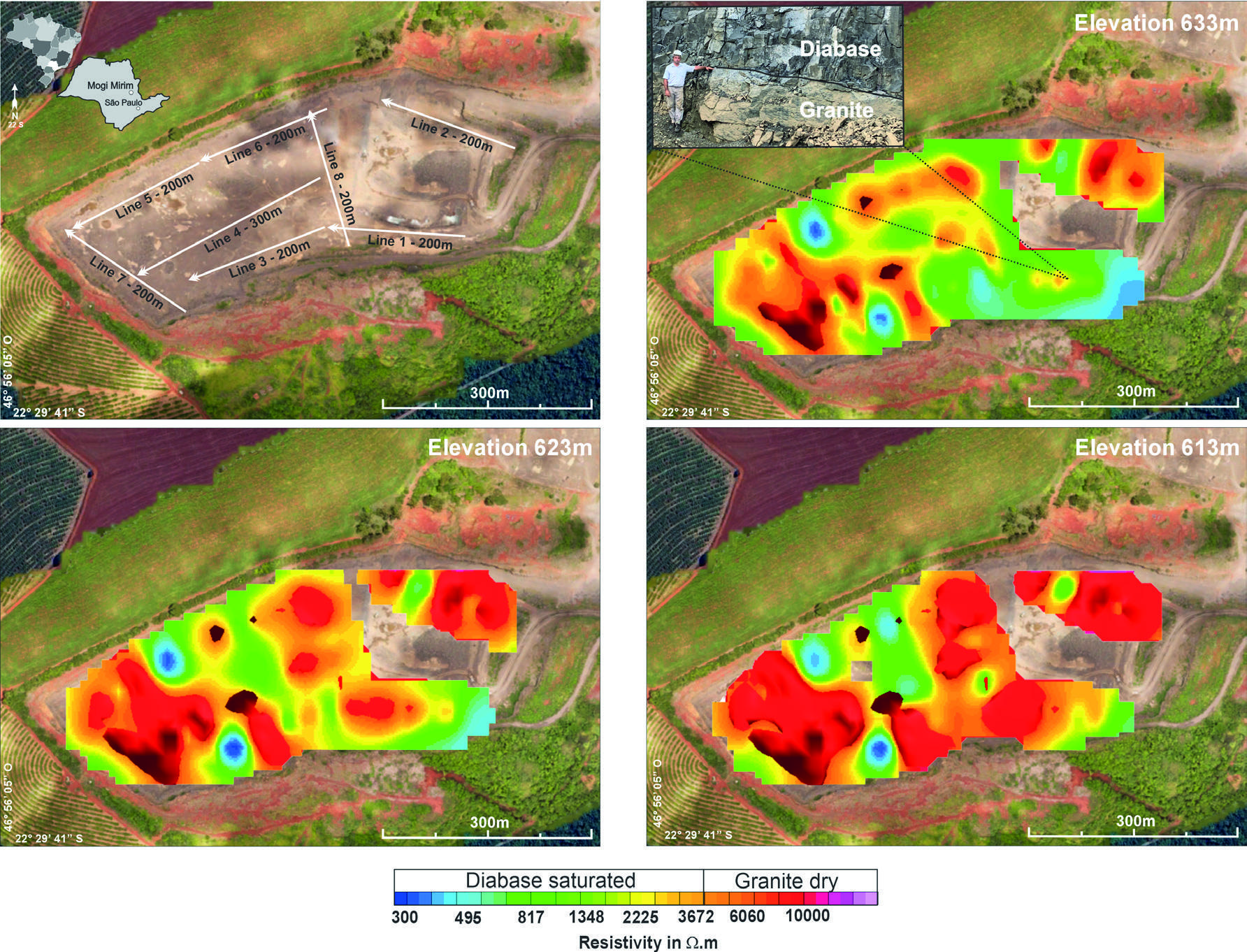 Part of the zones of high electrical resistivity attributed to granites may be made up of massive diabase, a scenario which makes it impossible to discriminate between rocks based on similar electrical resistivity values. It is likely that the joints and fractures visible in mining fronts are partly attributed to blasting and decompression events due to rock removal. However, the columnar disjunction is a recurring structure in all the exposed faces in the pit and a characteristic of the diabase in this area. In this sense, the possible existence of massive diabase is somewhat unrepresentative. Certainly, the intervals of low electrical resistivity represent areas of water-saturated diabase.