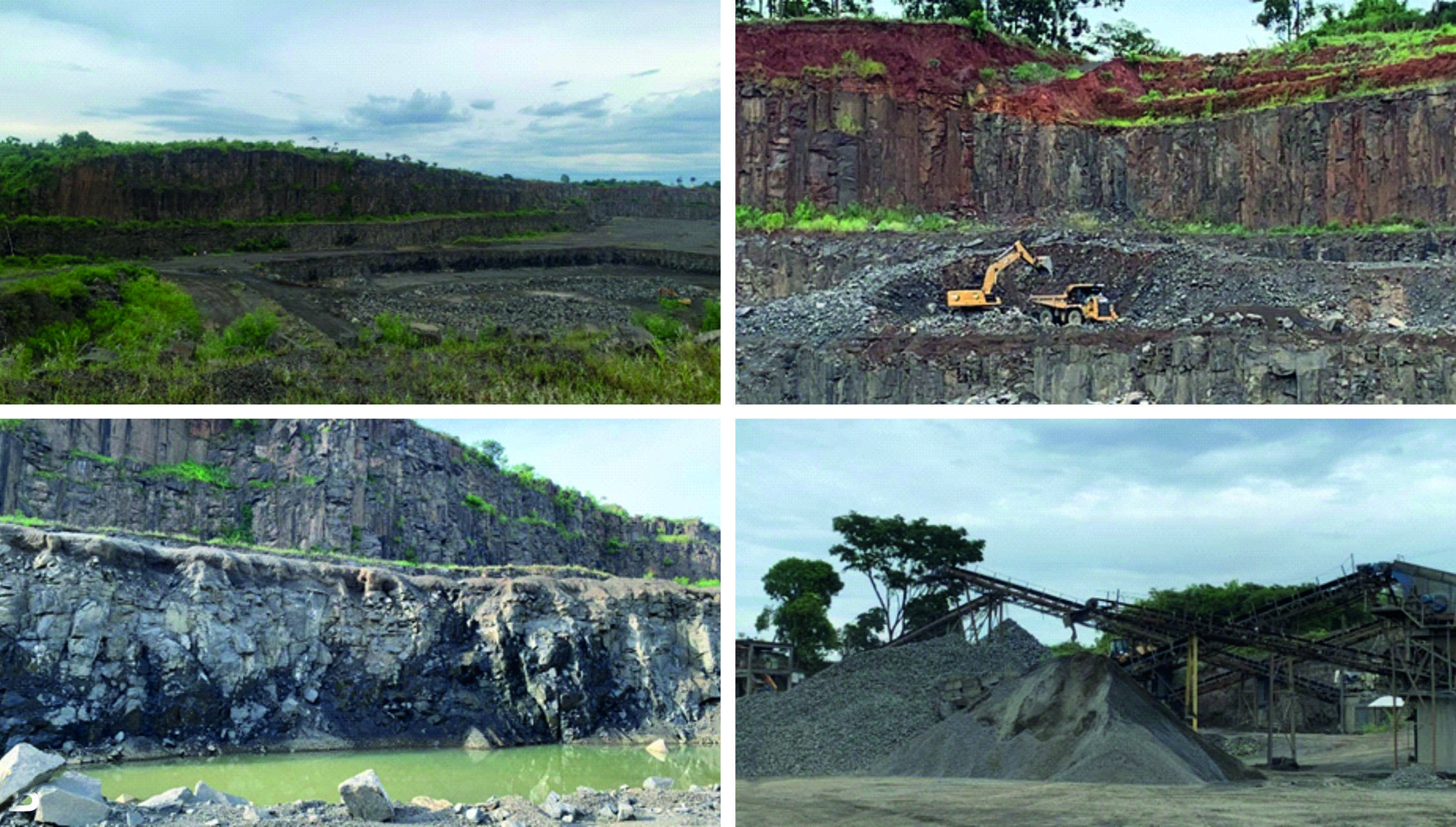 Figure 1. Main compartments of the study area. A) Panoramic view of the open pit mine. B) Bottom of pit with diabase saturated in water. C) Loading and transportation of dismantled rock, with soil and columnar diabase in the background. D) Crushing process and stacking the ore for sale.