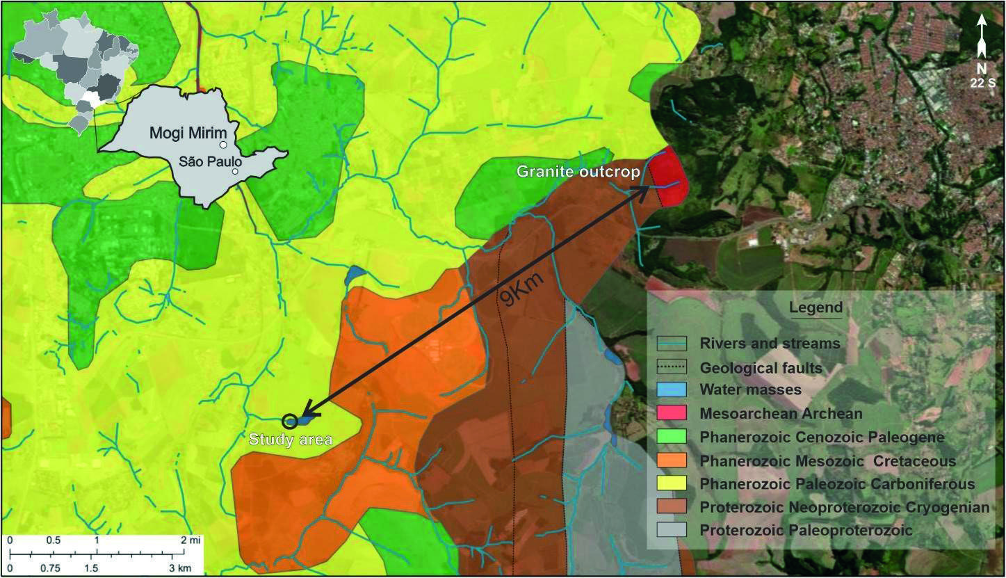 Figure 2. Geological map of the study area with the age of each lithology and highlighting the distance between the granite outcrops typically present in this area of the state of São Paulo and the quarry.
