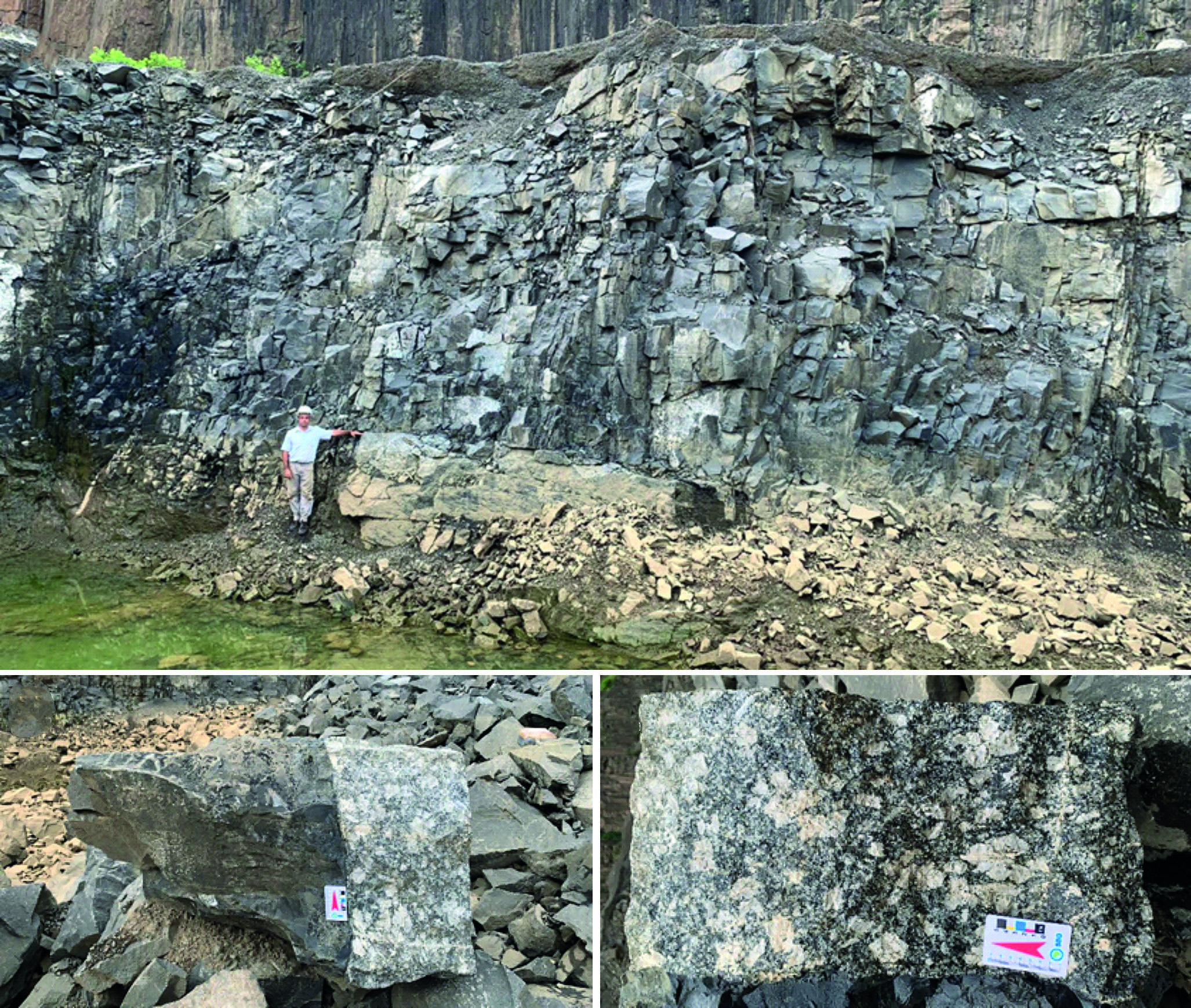 Figure 3. Diabase block in contact with gray porphyritic granite (left), detail of porphyritic granite with dark gray matrix composed of biotite and quartz (right), mining front with contact between strongly fractured columnar diabase (above) and porphyritic granite with not very expressive horizontal fractures (below).