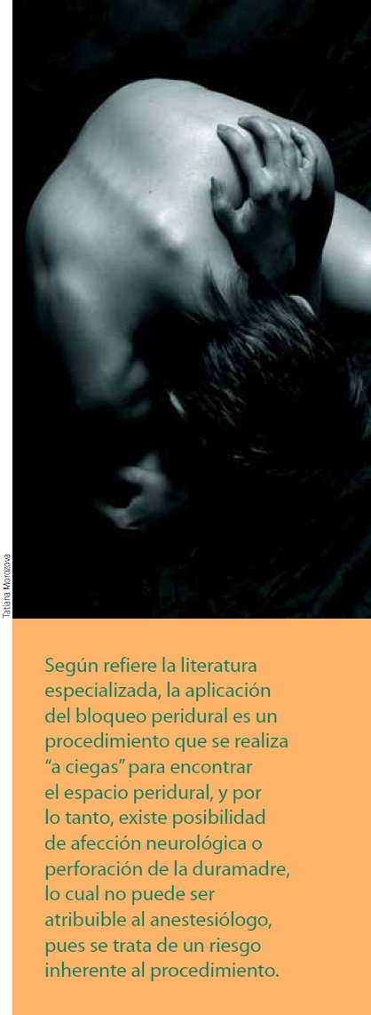 Según refiere la literatura especializada, la aplicación del bloqueo peridural es un procedimiento que se realiza "a ciegas" para encontrar el espacio peridural, y por lo tanto, existe posibilidad de afección neurológica o perforación de la duramadre, lo cual no puede ser atribuible al anestesiólogo, pues se trata de un riesgo inherente al procedimiento.