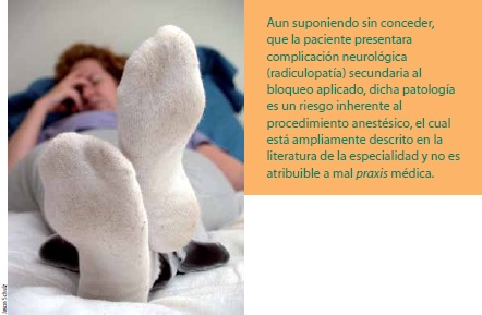Aun suponiendo sin conceder, que la paciente presentara complicación neurológica (radiculopatía) secundaria al bloqueo aplicado, dicha patología es un riesgo inherente al procedimiento anestésico, el cual está ampliamente descrito en la literatura de la especialidad y no es atribuible a mal praxis médica.