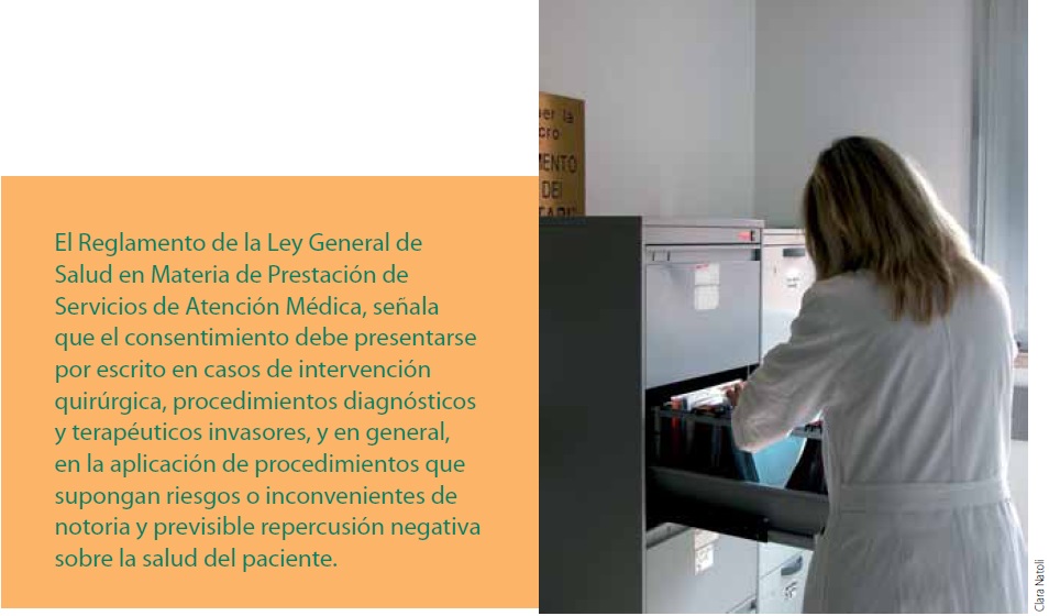 El Reglamento de la Ley General de Salud en Materia de Prestación de Servicios de Atención Médica, señala que el consentimiento debe presentarse por escrito en casos de intervención quirúrgica, procedimientos diagnósticos y terapéuticos invasores, y en general, en la aplicación de procedimientos que supongan riesgos o inconvenientes de notoria y previsible repercusión negativa sobre la salud del paciente.