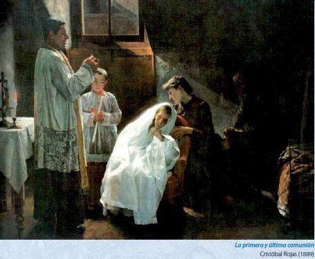 En la primera pintura, realizada en 1889 por el pintor venezolano Cristóbal Rojas, titulada de una manera melodramática La primera y última comunión, se observan seis personas en un recinto por demás lóbrego; la desesperanza es la reina de la obra, y en el centro está una niña que recibe la primera y probablemente última comunión; en su rostro se aprecian síntomas de tuberculosis en estado terminal, yace caquéctica y devastada. Cristóbal Rojas Poleo (1858-1890) es, junto con Arturo Michelena, uno de los pintores venezolanos más importantes del siglo XIX; tuvo una infancia pobre, y gracias a un cuadro que presentó en el centenario del nacimiento de Simón Bolívar, se hizo acreedor a una beca que lo llevó a París, en donde hizo la mayor parte de su obra.