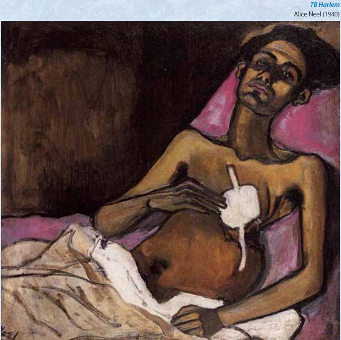 La segunda pintura, realizada en 1940 por la pintora norteamericana Alice Neel, titulada sin ambages TB Harlem, retrata a Carlos Negrón, un joven afectado por tuberculosis quien presenta la facies propia de un tísico crónico: aspecto caquéctico, emaciado, cansado y deteriorado. Esta obra también muestra uno de los tratamientos usados en la era preantibiótica para manejar la tuberculosis: la toracotomía, que consistía en fracturar las costillas y comprimir el tórax donde estaban las cavernas tuberculosas.