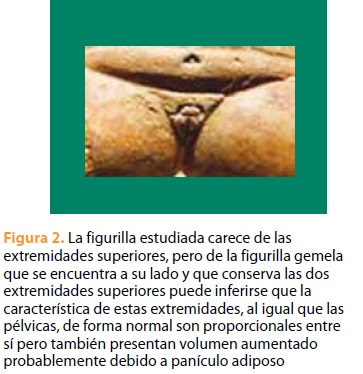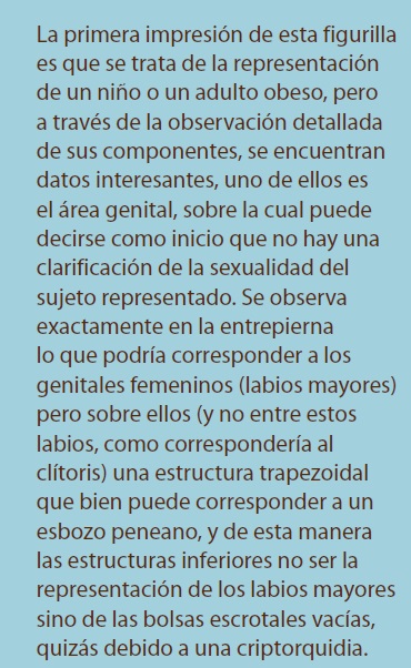 4. Punto de gran interés es el área genital (figura 2), sobre la cual puede decirse como inicio que no hay una clarificación de la sexualidad del sujeto representado. Se observa exactamente en la entrepierna lo que podría corresponder a los genitales femeninos (labios mayores) pero sobre ellos (y no entre estos labios, como correspondería al clítoris) una estructura trapezoidal que bien puede corresponder a un esbozo peneano, y de esta manera las estructuras inferiores no ser la representación de los labios mayores sino de las bolsas escrotales vacías, quizás debido a una criptorquidia.