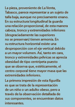 Dicha pieza (figura 1) proveniente de La Venta, Tabasco, es de barro, sólida, café, de 15 cm de altura, no contiene elementos de pastillaje y sólo se utilizó la técnica de rasgado y punzón para delinear el cuerpo, rostro y facies. Parece representar a un sujeto de talla baja, aunque no precisamente enano. En su estructura longitudinal la pieza guarda una relación proporcional, de esta manera cabeza, tronco y extremidades inferiores (desgraciadamente las superiores no se preservan) tienen armonía. En su estructura horizontal existe una desproporción con el eje vertical debido a un mayor volumen. Así, tanto en cara, tronco y extremidades pélvicas se aprecia obesidad de tipo centrípeta puesto que se observa que, estéticamente, el centro corporal tiene mayor masa que las extremidades inferiores.