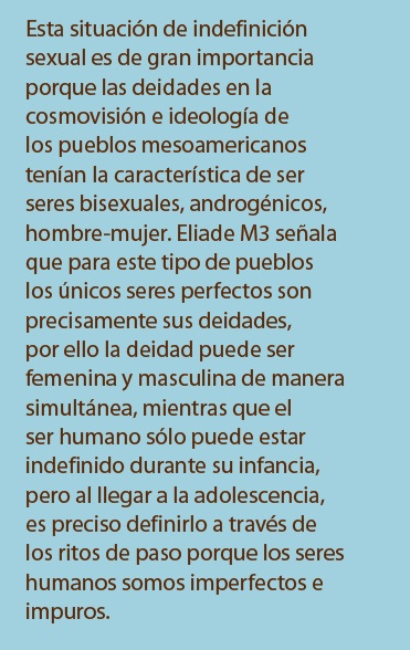 Esta situación de indefinición sexual es de gran importancia porque las deidades en la cosmovisión e ideología de los pueblos mesoamericanos tenían la característica de ser seres bisexuales, androgénicos, hombre-mujer. Eliade M3 señala que para este tipo de pueblos los únicos seres perfectos son precisamente sus deidades, por ello la deidad puede ser femenina y masculina de manera simultánea, mientras que el ser humano sólo puede estar indefinido durante su infancia, pero al llegar a la adolescencia, es preciso definirlo a través de los ritos de paso porque los seres humanos somos imperfectos e impuros.