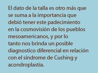 La talla baja es un dato importante, ya que al igual que a los acondroplásicos y otros sujetos de estatura similar, los nahuas (grupo de pueblos nativos de Mesoamérica cuyos ancestros fueron los mexicas, descendientes de los aztecas y otros pueblos antiguos de Anáhuac, que tenían en común la lengua náhuatl) los relacionaban con los tlaloque, los enanos ayudantes de la deidad Tlalocantecuhtli, que vivían en los montes y cerros, donde se formaban las nubes de donde provenían las lluvias. Así, este dato es otro más que se suma a la importancia que debió tener este padecimiento en la cosmovisión de los pueblos mesoamericanos, y por lo tanto nos brinda un posible diagnóstico diferencial en relación con el síndrome de Cushing y acondroplastia.