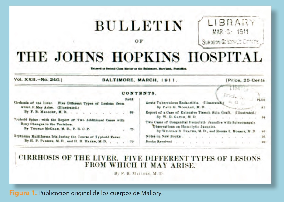 En 1911 el Dr. Frank Burr Mallory, patólogo del Boston City Hospital, publicó en el boletín del Hospital Johns Hopkins un artículo titulado "Cirrosis del hígado. Cinco tipos de lesiones de las cuales puede originarse" (figura 1), en el que describió las cirrosis tóxica, infecciosa, pigmentaria, sifilítica y alcohólica. En los hepatocitos de pacientes con cirrosis alcohólica observó inclusiones citoplásmicas hialinas que se teñían intensamente con eosina y hematoxilina fosfotúngstica; los hepatocitos eran rodeados y destruidos por leucocitos polimorfonucleares1 (figura 2). Las inclusiones recibieron el nombre de "cuerpos de Mallory" (CM), "hialino-alcohólico" o "hialino de Mallory".