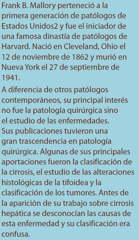 Frank B. Mallory perteneció a la primera generación de patólogos de Estados Unidos2 y fue el iniciador de una famosa dinastía de patólogos de Harvard. Nació en Cleveland, Ohio, el 12 de noviembre de 1862 y murió en Nueva York el 27 de septiembre de 1941. Uno de sus biógrafos menciona que su padre trabajó durante toda su vida como marinero en los Grandes Lagos. Por insistencia de su madre, Frank y su hermana Eleanor iniciaron sus primeros estudios. En 1890 Mallory recibió el grado de doctor en la Escuela de Medicina de Harvard; para pagar sus estudios trabajó como histotecnólogo en el departamento de histología, actividad que despertó su interés por las tinciones histológicas y seguramente influyó en la decisión de dedicarse a la patología. Al concluir sus estudios desempeñó varios trabajos: fue instructor de histología, alimentaba a pacientes que tenían enfermedades mentales a través de una sonda gástrica en un hospital y durante varios meses intentó dedicarse a la práctica privada de la medicina; la circunstancia que le hizo desistir de esta última actividad fue que su primera paciente le pidió que interrumpiera su embarazo. En 1891 fue contratado como asistente del Dr. William T. Councilman, profesor de patología de la Escuela de Medicina de Harvard y patólogo del Boston City Hospital. Dos años después contrajo matrimonio y en su luna de miel viajó a Europa, donde permaneció un año trabajando con Chiari en Praga y con Ziegler, un prolífico autor de libros de texto de patología, en Freiburg4. A su regreso a Estados Unidos fue profesor asistente de patología en Harvard; en 1901 fue nombrado profesor asociado y en 1908, al retirarse Councilman, ocupó el puesto de jefe de patología. En 1932, a los 70 años de edad, recibió el nombramiento de profesor emérito y consultante del Boston City Hospital3.