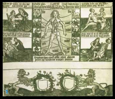 1. Grabado en madera mostrando los sitios de la sangría en el Siglo XV (Graphische Sammlung, Munich).