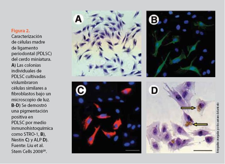 El ligamento periodontal contiene células progenitoras que tienen el potencial de diferenciarse en osteoblastos comparable con células madre de médula ósea caracterizadas previamente (figura 2). Esta población adulta de PDLSC puede utilizarse para procedimientos terapéuticos potenciales relacionados a regeneración periodontal en defectos óseos en proximidad con órganos dentarios17, e inclusive para implantes dentales21.
