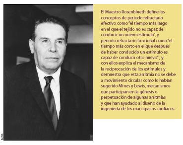 Por otro lado, este científico estudio la fisiología de la conducción atrioventricular a nivel de la unión AV y corroboró los hallazgos de Moe (Moe GR. y cols. Circulation Res.1956;4:357569), de que en esta estructura anatómica puede haber conducción anterograda (atrioventricular) o retrograda (ventrículo atrial) (Am J Physiol. 1958;194[3]:4958), lo que lo llevó a describir junto con el Dr. Rafael Rubio los ecos ventriculares (Am J Physiol. 1958;195[I]: 5360). El maestro Rosenblueth define los conceptos de periodo refractario efectivo como "el tiempo más largo en el que el tejido no es capaz de conducir un nuevo estímulo", y periodo refractario funcional como "el tiempo más corto en el que después de haber conducido un estímulo es capaz de conducir otro nuevo" (Physiol. 1949;33:40540), y con ellos explica el mecanismo de la reciprocación de los estímulos y demuestra que esta arritmia no se debe a movimiento circular como lo habían sugerido Mines (J Physiol. 1913;46:34960) y Lewis (The mechanism en el Graphic Registration of Heart Beat, London, 1925), mecanismos que participan en la génesis o perpetuación de algunas arritmias y que han ayudado al diseño de la ingeniería de los marcapasos cardiacos. Este descubrimiento, y las leyes fisiológicas que lo rigen, dieron base para el entendimiento de las arritmias reciprocantes, de lo cual se han desprendido el entendimiento, los criterios de diagnóstico, así como los terapéuticos (taquicardias reciprocantes de origen auricular o de origen ventricular) (Sung y cols. Circulation. 1979; 60:146476).