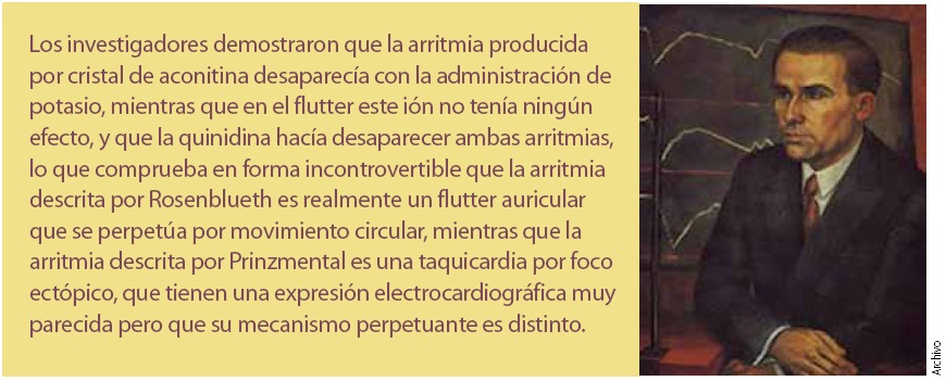 Se definieron así, las características para que un frente de onda pudiera perpetuar una arritmia por movimiento circular a nivel de las aurículas, con lo que se dio el sustento teórico electrofisiológico que hipotéticamente caracterizaba al flutter auricular, y con base en este concepto, los doctores Rosenblueth y Juan García Ramos, provocaron experimentalmente un obstáculo al machacar un área proximal a la vena cava inferior y se administraron trenes de estímulos en la aurícula del perro, lo cual inició un movimiento circular eléctrico que se perpetúa en el tiempo (Arch Inst Cardiol Méx. 1947;17:44153); es decir, se provocó un flutter auricular experimental, técnica que sirvió para que fuera empleada por otros investigadores en farmacología, como Lanari (Circulation Res. 1956;4:28290), Sharma (Brit Heart J. 1963;25:6308) y Méndez (Acta Cardiol. 1965;20:116), para probar el efecto de diversos fármacos sobre el flutter auricular.
