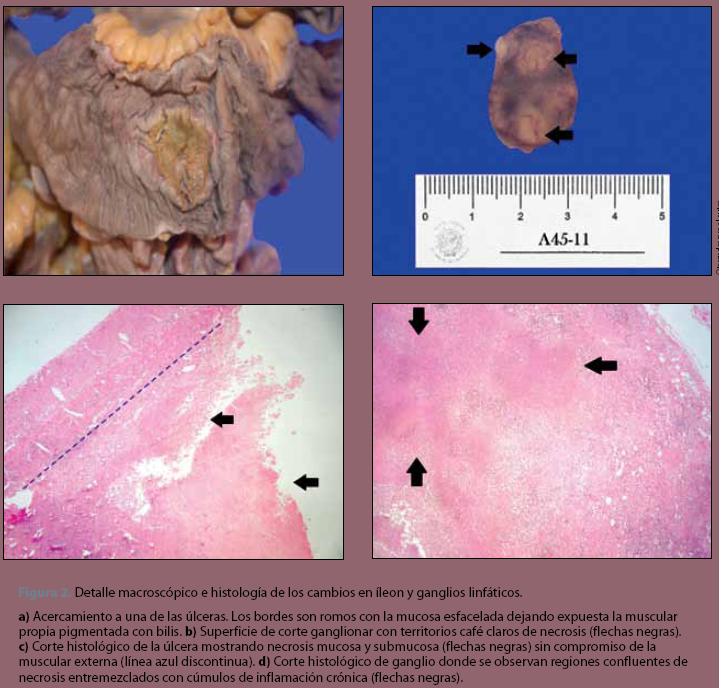 Se realizó el estudio de autopsia con los siguientes hallazgos durante la prosección: en el borde antimesentérico del íleon terminal había múltiples úlceras ovales, de bordes bien definidos y sobreelevados con centro verde olivo (figuras 1 y 2a). Los ganglios mesentéricos estaban aumentados de tamaño y con áreas de necrosis en la superficie de corte (figuras 1 y 2b). También destacaron úlceras puntiformes en colon. En otros órganos: hepatización pulmonar, congestión hepática, esplénica y renal, así como manchas purpúricas en mesencéfalo y puente. El resto de los órganos no evidenciaba alteraciones a nivel macroscópico.