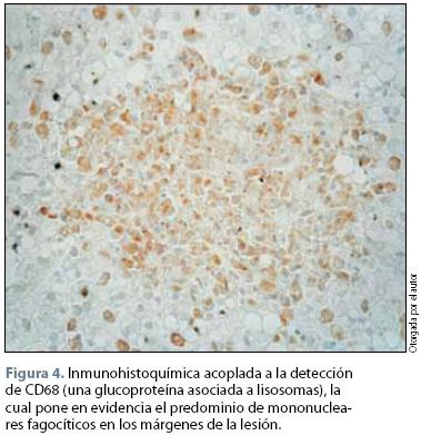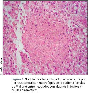 En la fase de invasión activa hay una bacteremia en la que pueden aparecer lesiones inflamatorias focales. Las placas de Peyer y los agregados linfoides de apéndice y colon se hipertrofian. Los órganos del sistema retículoendotelial (fagocítico mononuclear) se hallan hiperplásicos y congestivos. A nivel microscópico se observa infiltración de estos tejidos por macrófagos (células de Mallory)9, linfocitos y células plasmáticas con predominio y aglutinación de los primeros, mismos que fagocitan activamente bacilos, eritrocitos y linfocitos degenerados (hemofagocitosis)10,11. Esta lesión inflamatoria constituida característicamente por agregados de macrófagos es denominada nódulo tifoideo (figuras 3 y 4), también conocida como nódulo tifoídico o tifoso. Este último sin embargo, puede generar confusión con el nódulo tifoso propio del tifus exantemático (nódulo de Fraenkel)12.