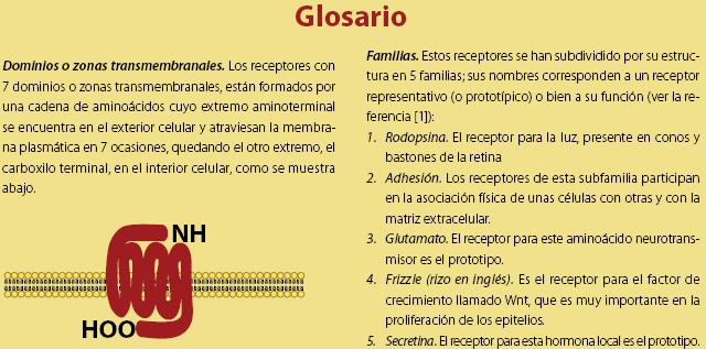Descifrar el genoma humano ha permitido, entre muchas otras cosas útiles, conocer el número aproximado de receptores que tenemos, clasificarlos y analizarlos en su estructura y función; es decir, mejorar nuestro conocimiento de cada familia y tipo de receptor. Así, el número de genes que codifican para receptores de siete dominios transmembranales se estima en un poco más de 850; de ellos, la inmensa mayoría (aproximadamente 750) pertenecen a la familia de la Rodopsina y el resto a las otras familias (Adhesión, Glutamato, Frizzle y Secretina)1. Se estima que estos receptores representan entre el 1 y el 5% de los genes presentes en los genomas conocidos (desde los de hongos y plantas, hasta el humano). También se ha calculado que, en el caso de los humanos, son el blanco de un porcentaje muy alto (3050%) de fármacos que se usan en la actualidad1.