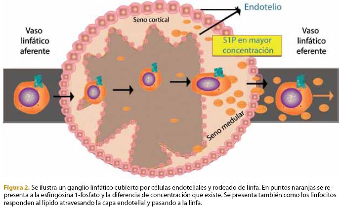 Un aspecto particularmente interesante de la esfingosina 1fosfato es su papel en la inmunidad, pues sus receptores están presentes en diversas células del sistema inmunológico y regulan sus funciones4. Por ejemplo, una función muy importante y de descubrimiento relativamente reciente es la participación del esfingolípido y su receptor S1P1 en el egreso de los linfocitos de los ganglios linfáticos4 (figura 2). Cuando los linfocitos están en ganglios linfáticos, y no se presenta ningún antígeno como señal de activación, la expresión del receptor S1P1 en la membrana plasmática es alta permitiendo que los linfocitos respondan migrando al gradiente de esfingosina 1fosfato que existe en su entorno. Dicho gradiente se encuentra entre el líquido intersticial de la corteza, médula y centros germinales del ganglio donde la esfingosina 1fosfato se encuentra en bajas concentraciones, y los senos cortical y medular que tiene altas concentraciones. Por allí pasa la linfa para salir por los vasos eferentes. Entonces, podríamos decir que los linfocitos son atraídos por el esfingolípido, al cual "sienten" a través de sus receptores S1P1, migran a la linfa y de allí pasan a la circulación general (figura 2). Es decir, el tráfico de los linfocitos de los ganglios a la circulación es regulado por la concentración relativa de este esfingolípido y la presencia del receptor S1P1 en estas células; dicho tráfico es fundamental para mantener el nivel de linfocitos circulantes y por ende en la respuesta inmunológica del organismo.