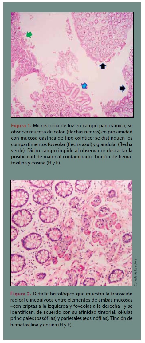Resultados: En la muestra recibida se observaron fragmentos entremezclados de mucosa de colon y mucosa gástrica de tipo oxíntico (fúndica) cuyos adenómeros se hallaban en estrecha relación con las criptas de Lieberkühn.