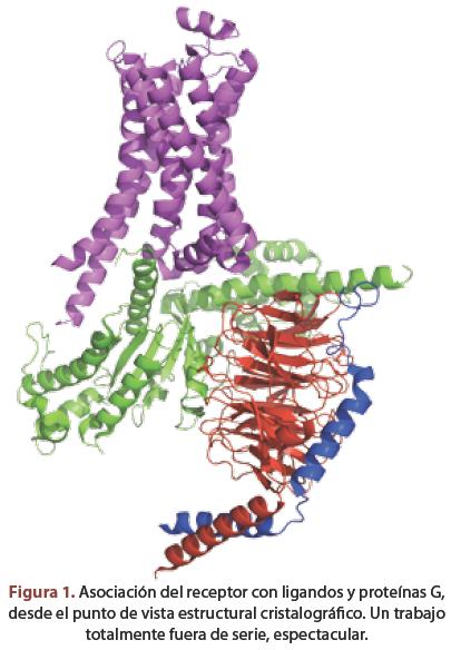 Brian Kobilka es un investigador unos 15 años más joven que Lefkowitz. Yo diría que está en la etapa central de su carrera. Su entrenamiento preuniversitario (Bachelor) fue con énfasis en biología y química. Obtuvo su grado de médico con honores en Yale University School of Medicine y se unió al grupo de Lefkowitz como posdoctoral para, después de algunos años, tomar una posición independiente en Stanford University. A Kobilka lo conozco mucho menos que a Lefkowitz, solamente lo he escuchado en algunos congresos e intercambiado algún saludo. Es un hombre muy delgado, reservado y siempre muy centrado en su trabajo. Como ya mencioné, participó con el grupo de Lefkowitz en la clonación de receptores, en la identificación de dominios funcionales creando quimeras y mutantes puntuales o truncadas y otros muchos aspectos también importantes. Sin embargo su principal contribución como investigador independiente es el estudio detallado del receptor a nivel atómico por técnicas cristalográficas. Al inicio de su carrera independiente combinó estudios funcionales en células y animales knockout (en los que se elimina la expresión de un receptor o proteína reguladora) para posteriormente centrarse fundamentalmente en aspectos de estructura. No deja de sorprender que siendo médico haya seleccionado estos aspectos que requieren, no solamente equipo muy particular, sino un entrenamiento intenso y enormemente especializado, muy alejado de la práctica médica e incluso de las áreas básicas. Ya al final del siglo XX y los primeros años del XXI estudia cambios conformacionales en los receptores bajo la acción de agonistas y antagonistas por métodos fluorescentes. Hace solamente 5 años, en 2007, aparecen las primeras publicaciones de la estructura cristalográfica de un receptor de este tipo11,12. En los siguientes años ha estudiado desde el punto de vista estructural cristalográfico la asociación del receptor con ligandos y proteínas G (figura 1), además de participar en el estudio cristalográfico de otros receptores, no adrenérgicos. En opinión de los que se dedican a la cristalografía se trata de un trabajo totalmente fuera de serie, espectacular.