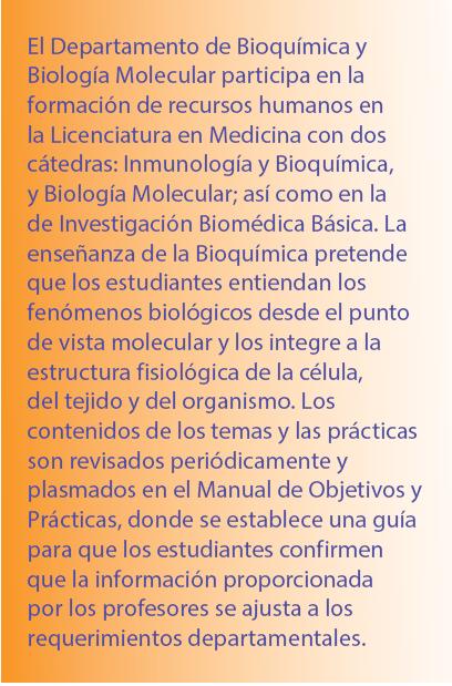 El Departamento de Bioquímica y Biología Molecular participa en la formación de recursos humanos en la Licenciatura en Medicina con dos cátedras (Inmunología y Bioquímica, y Biología Molecular), así como en la de Investigación Biomédica Básica, donde varios profesores imparten seminarios, son tutores de diversos programas de posgrado e imparten cursos en diversos programas de maestría y doctorado. La enseñanza de la Bioquímica pretende que los estudiantes entiendan los fenómenos biológicos desde el punto de vista molecular y los integren a la estructura fisiológica de la célula, del tejido y del organismo. La enseñanza se realiza en cursos teórico-prácticos. Los contenidos de los temas y las prácticas son revisados periódicamente y plasmados en el Manual de Objetivos y Prácticas, donde se establece una guía para que los estudiantes confirmen que la información proporcionada por los profesores se ajusta a los requerimientos departamentales. Las materias de Bioquímica y Biología Molecular e Inmunología son teórico-prácticas, y cuentan con 21 y 7 créditos respectivamente en el Plan 2010 de Estudios de la Carrera de Médico Cirujano.
