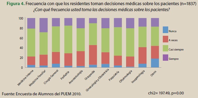 La frecuencia con que los residentes tomaron decisiones sobre el manejo de los pacientes estuvo por arriba de la media (figura 4). Esto refleja que las prácticas hospitalarias no siempre se apegan al supuesto de que la responsabilidad de las decisiones médicas es del profesor o del médico adscrito y no de los residentes que deberían ser supervisados en todo momento. Arriba de 70% de frecuencia se encontraron medicina interna, medicina familiar, cirugía, pediatría, psiquiatría y oftalmología; entre 60 y 69%, anestesiología y ginecología; menos de 59%, ortopedia, imagenología y otros (chi2 = 197.49, p = 0.00). La toma de decisiones aumentó levemente según el grado del residente, pasó de 90% en los R1 y R2 a 94% en los R3, R4 y más (chi2 = 59.28, p = 0.00).