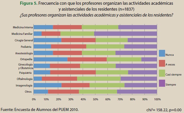 Uno de los aspectos centrales para propiciar un ambiente clínico óptimo para el aprendizaje es un servicio bien organizado donde las actividades académicas tengan un peso significativo. Al preguntarles si los profesores organizaban las actividades académicas y asistenciales de los residentes, éstos respondieron por especialidad de la siguiente manera (figura 5): en más de 70% de las ocasiones, medicina familiar; entre 60 y 69%, medicina interna, anestesiología, ginecología, oftalmología y otros; entre 50 y 59%, pediatría e imagenología; menos de 50%, cirugía, ortopedia y psiquiatría (chi2 = 158.22, p = 0.00). Destacó que a medida que avanzaron los años, las actividades organizadas por los profesores tendieron a disminuir: R1 63%, R2 59.6%, R3 58.1%, R4 50.7%, no obstante, a partir de R5 (64.3%) el comportamiento fue similar al de los R1 (chi2 = 42.15, p = 0.00).
