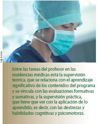 Una de las tareas principales del profesor en las residencias médicas consiste en supervisar las actividades académicas y asistenciales de los residentes. La supervisión teórica se relaciona con el aprendizaje significativo de los contenidos del programa y se vincula con las evaluaciones formativas y sumativas. La supervisión práctica tiene que ver con la aplicación de lo aprendido, es decir, con las destrezas y habilidades cognitivas y psicomotoras.