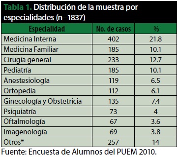 Del total de la muestra de la encuesta de alumnos del PUEM, se seleccionaron las 10 especialidades con mayor número de casos y las restantes se agruparon en la categoría "otros", el número de casos y los porcentajes por especialidad se presentan en la tabla 1. También se estratificaron los datos de acuerdo al grado académico de los residentes, la clasificación considera a los residentes de primer año R1 (482 casos = 26.2%), R2 (492 = 26.8%), R3 (404 = 22%), R4 (246 = 13.4%) y R5 y más (11.6%). Una variable que pudo haber influido en los resultados es la sede hospitalaria, no obstante, se excluyó del análisis para evitar señalar las características de algún curso en específico. Para aquellos interesados, los datos por sede se pueden solicitar en el Departamento de Investigación Educativa del Posgrado de la FM de la UNAM.