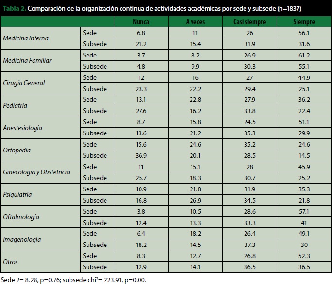 Las actividades académicas que se llevan de manera continua en las sedes según los residentes en las distintas especialidades con más de 80% de frecuencia en medicina interna, medicina familiar y oftalmología, entre 70 y 79% en cirugía, anestesiología, ginecología, imagenología y otros; entre 60 y 69% en pediatría y psiquiatría, y menos de 59% en ortopedia (chi2 = 144.96, p = 0.00). Según el grado académico, la realización de actividades educativas fue constante de un grado a otro, alrededor del 75%, lo preocupante está en saber lo que sucedía con el 25% restante (chi2 = 8.28, p = 0.76).