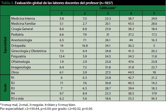 Al solicitarles a los residentes que evaluaran la conducción del proceso de enseñanza del profesor, del 1 al 5, donde 1 era muy mal, 2 mal, 3 regular, 4 bien y 5 muy bien, las cifras más altas se ubicaron en el número 4, seguidas del 3 y el 5. Los profesores peor evaluados fueron los de ortopedia y psiquiatría (tabla 3) (chi2 = 150.64, p = 0.00). Según el grado, los R5 fueron los más satisfechos con la conducción educativa de sus profesores, y los menos fueron los R2. Los R4 calificaron mal y muy mal a sus profesores en 18.1% (chi2 = 92.02, p = 0.00).