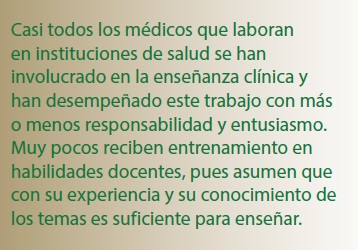 Casi todos los médicos que laboran en instituciones de salud se han involucrado en la enseñanza clínica en algún momento de su trayectoria, y han desempeñado este trabajo con más o menos responsabilidad, compromiso y entusiasmo. No obstante, muy pocos reciben entrenamiento en habilidades docentes, pues asumen que con su experiencia y su conocimiento de los temas es suficiente para enseñar. Para que la instrucción de los residentes sea efectiva se requieren varias estrategias didácticas y actividades diversas para el aprendizaje de contenidos y saberes.