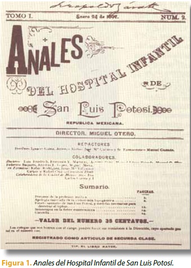 Durante los años de 1896 y 1897 publicó Anales del Hospital Infantil de San Luis Potosí (figura 1), primera revista científica pediátrica editada en el país y una de las primeras en América Latina, de la que se publicaron 8 números3, y colaboró para formar la Sociedad Médica Potosina, en 1899.