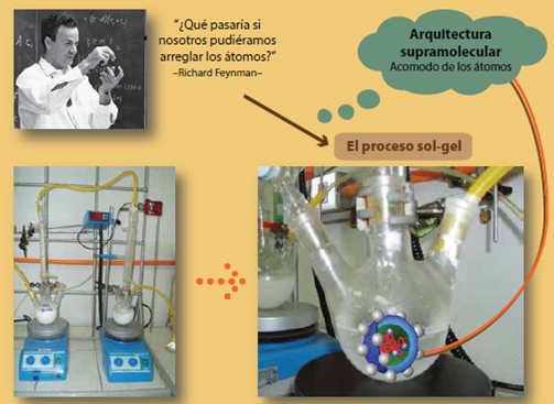 En dichos laboratorios se ha perfeccionado desde hace tiempo la técnica sol-gel6, que es un método para obtener micelas formadas por nanopartículas de óxidos de cualquier metal. El proceso sol-gel es la transferencia de una suspensión coloidal formada por partículas tan pequeñas como armstrongs, y durante el tiempo de gelación se aglomeran y forman un gel que al secarse al vacío tiene la forma de polvo, el cual es manipulable para diversos fines (figura 1).