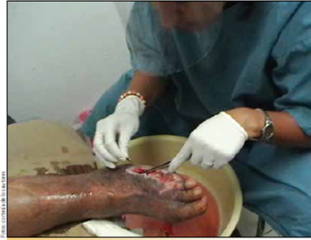 El pie diabético es una de las complicaciones más graves y representa el 17 por ciento de todas las complicaciones de la enfermedad; la combinación de neuropatía, micro y macroangiopatía, da por resultado la progresión de una pequeña lesión a lesiones más grandes que pueden terminar con la gangrena del pie, tanto así que el 80 por ciento de todas las amputaciones de miembros inferiores se debe a complicaciones de la diabetes1. Su tratamiento requiere de una atención constante, prevención de las lesiones, por pequeñas que sean, en el pie, y limpieza, debridación, tratamiento con antibiótico y protección de zonas de presión en el pie.