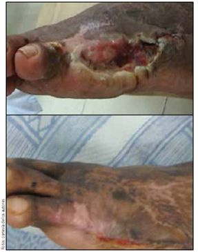 Las primeras observaciones mostraron la herida seca o con menor secreción, desaparecieron las áreas necróticas, evidencia de tejido de granulación, la coloración de la zona mejoró, bajó el edema perilesional con la progresión hacia la cicatrización, los cultivos al terminar el tratamiento fueron negativos y la apariencia del pie diabético fue más sana; 7 pacientes no terminaron su tratamiento porque dejaron de asistir al Centro, uno de ellos debido a muerte por infarto del miocardio.